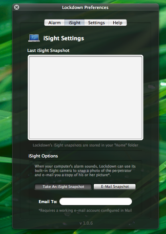 W ustawieniach należy określić na jakie rodzaje czynników zewnętrznych Lockdown ma reagować. Alarm może wyzwalać dotknięcie klawiatury, poruszenie myszy, odłączenie zasilania, czy poruszenie komputerem. W przypadku uruchomienia, program może robić intruzowi zdjęcie za pomocą kamery iSight i wysyłać je na zdefiniowany adres e-mail.